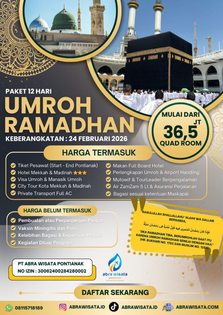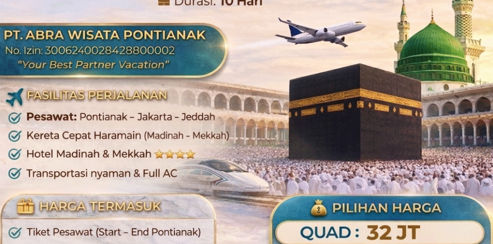 Alhamdulillah wa syukurillah, pengalaman umroh bersama Abra Wisata Pontianak, sangat memuaskan, dari keberangkatan hingga pulang. Kita benar-benar puas dengan service yang di berikan. Pesawat nya garuda, hotel di Madinah dan Mekkah sangat dekat. Sangat menikmati perjalanan, fokus dan khusyuk saat ibadah tanpa memikirkan yang lain2 nya karena semua kebutuhan dan keperluan kita selama di sana sudah di handle dengan sangat baik. sangat di rekomendasikan sih travelnya. Insya Allah amanah.