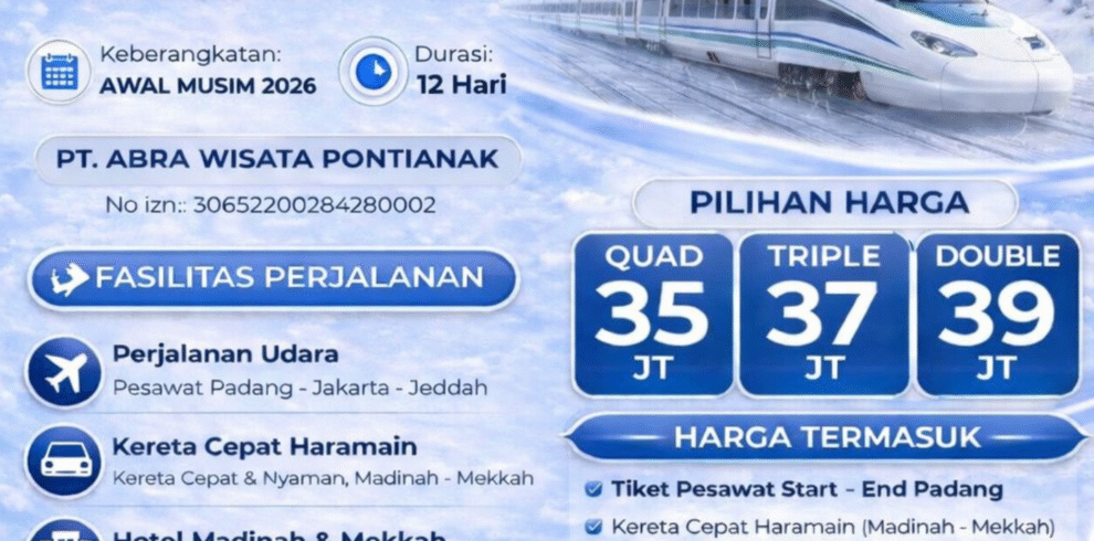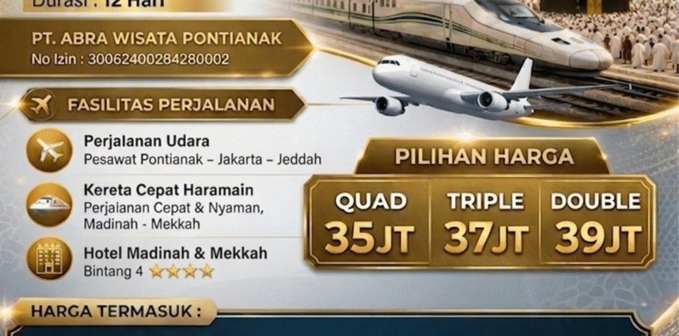 Kami menyediakan berbagai pilihan paket Umroh dan Tour yang fleksibel sesuai kebutuhan Anda - mulai dari paket reguler, VIO, hingga private group. Ingin itinerary khusus, tanggal keberangkatan sendiri, atau penyesuaian layanan? Abra Wisata siap wujudkan perjalanan ibadah dan wisata sesuai keinginan Anda.