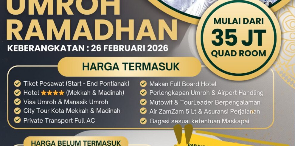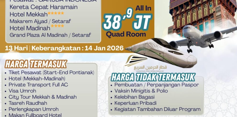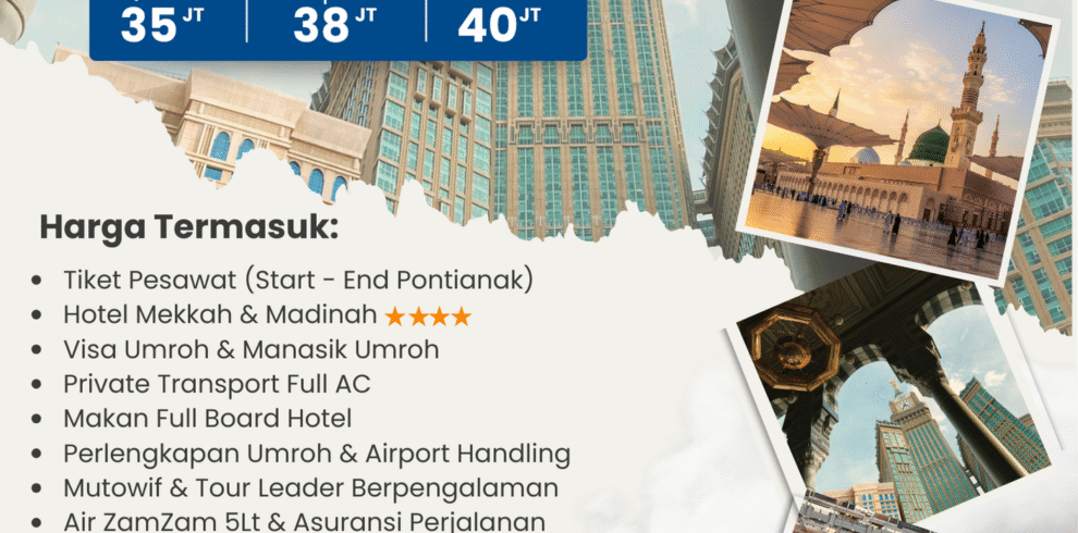 Trip Search Result Filter By Clear all Destination Bandung1Kuching-Kuala Lumpur1Mekkah-Madinah3Pontianak - Kuala Lumpur1Singapore1Yogyakarta1Show MoreShow Less PriceRp0Rp38.900.000 Duration 1 Days 13 Days Activities Paket Haji & Umroh3Tour Domestik2Tour International3 Trip Types Umtoh Awal Tahun + Thoif 20261 Difficulties Easy1Medium1 Sort (Recently Added) Recently Added Top Rated Lowest Price First Highest Price First Shortest Duration First Longest Duration First Alphabetical - A to Z Alphabetical - Z to A View by : Apply Filters Umroh Ramadhan 2026 Mekkah-Madinah 1 People Duration 10 Days - 8 Nights Rp35.000.000 View Details Next Departures Desember 27, 2025 (Available)Desember 28, 2025 (Available)Desember 29, 2025 (Available) Availability: JanFebMarAprMeiJunJulAguSepOktNovDes Umroh Awal Tahun + Thoif 2026 Mekkah-Madinah Duration 13 Days - 11 Nights Rp38.900.000 View Details Next Departures Desember 27, 2025 (Available)Desember 28, 2025 (Available)Desember 29, 2025 (Available) Availability: JanFebMarAprMeiJunJulAguSepOktNovDes One day Tour Singapore Singapore Duration 1 Day - 0 Nights Rp1.450.000 View Details Next Departures Desember 27, 2025 (Available)Desember 28, 2025 (Available)Desember 29, 2025 (Available) Availability: JanFebMarAprMeiJunJulAguSepOktNovDes Tour Kuala Lumpur (PNK-KCH-KL) Kuching-Kuala Lumpur Duration 4 Days - 3 Nights Rp4.099.000 View Details Next Departures Desember 27, 2025 (Available)Desember 28, 2025 (Available)Desember 29, 2025 (Available) Availability: JanFebMarAprMeiJunJulAguSepOktNovDes Tour Bandung Bandung Duration 4 Days - 3 Nights Rp4.549.000 View Details Next Departures Desember 27, 2025 (Available)Desember 28, 2025 (Available)Desember 29, 2025 (Available) Availability: JanFebMarAprMeiJunJulAguSepOktNovDes Umrah Syawal 2026 Mekkah-Madinah Medium Duration 10 Days - 8 Nights Rp35.000.000 View Details Next Departures Desember 27, 2025 (Available)Desember 28, 2025 (Available)Desember 29, 2025 (Available) Availability: JanFebMarAprMeiJunJulAguSepOktNovDes Jogja Serenity Trip Yogyakarta Duration 4 Days - 3 Nights View Details Availability: JanFebMarAprMeiJunJulAguSepOktNovDes KUALA LUMPUR TOUR Pontianak - Kuala Lumpur Easy Duration 4 Days - 3 Nights View Details Availability: JanFebMarAprMeiJunJulAguSepOktNovDes