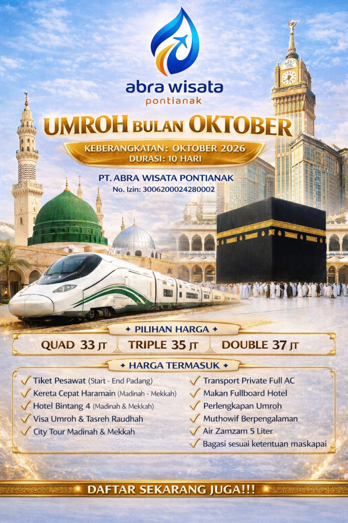 Rasakan perjalanan ibadah yang penuh makna bersama Abra Wisata Pontianak dalam program Umroh Bulan Oktober 2026.
